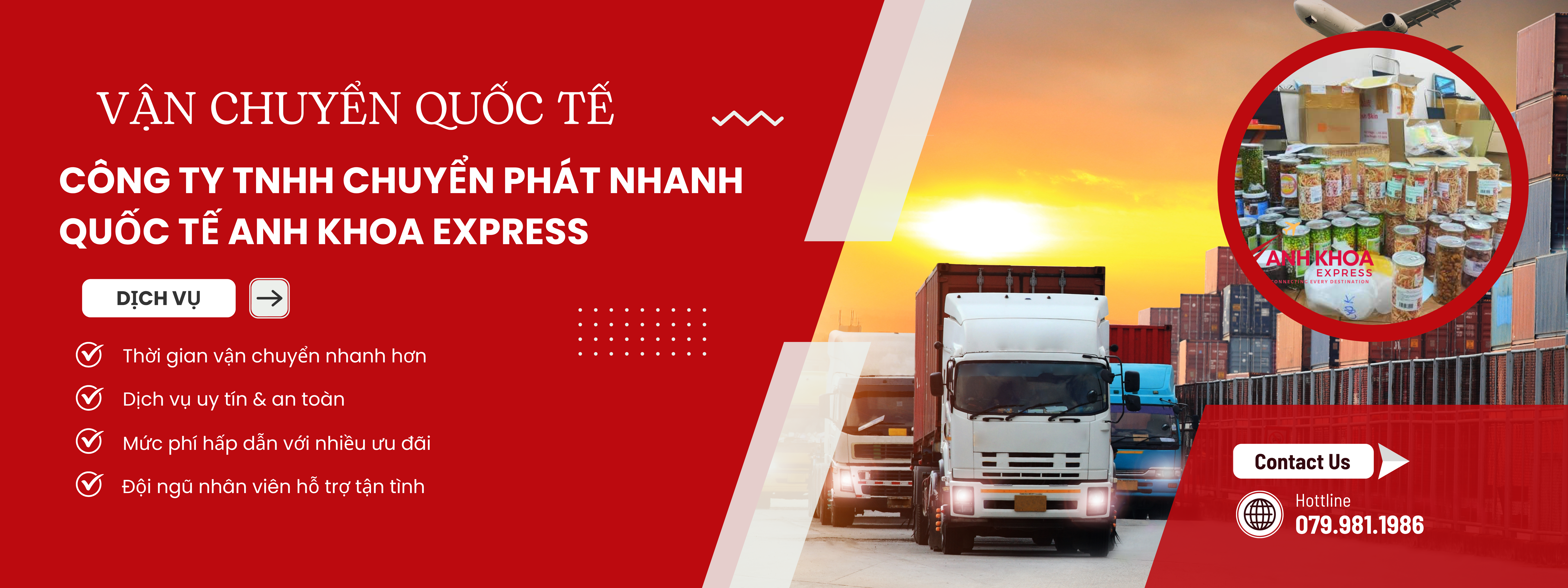 CÔNG TY TNHH CHUYỂN PHÁT NHANH QUỐC TẾ ANH KHOA EXPRESS là đơn vị hoạt động trong lĩnh vực vận chuyển quốc tế, chuyên cung cấp dịch vụ gửi thực phẩm, mỹ phẩm, bưu phẩm, chứng từ và hàng hóa đi các quốc gia trên thế giới. Với phương châm “Nhanh chóng – An toàn – Tận tâm”, chúng tôi cam kết mang đến giải pháp vận chuyển tối ưu, giúp kết nối khách hàng với người thân, đối tác toàn cầu một cách hiệu quả. Anh Khoa Express luôn nỗ lực nâng cao chất lượng dịch vụ và mở rộng mạng lưới phục vụ toàn diện.